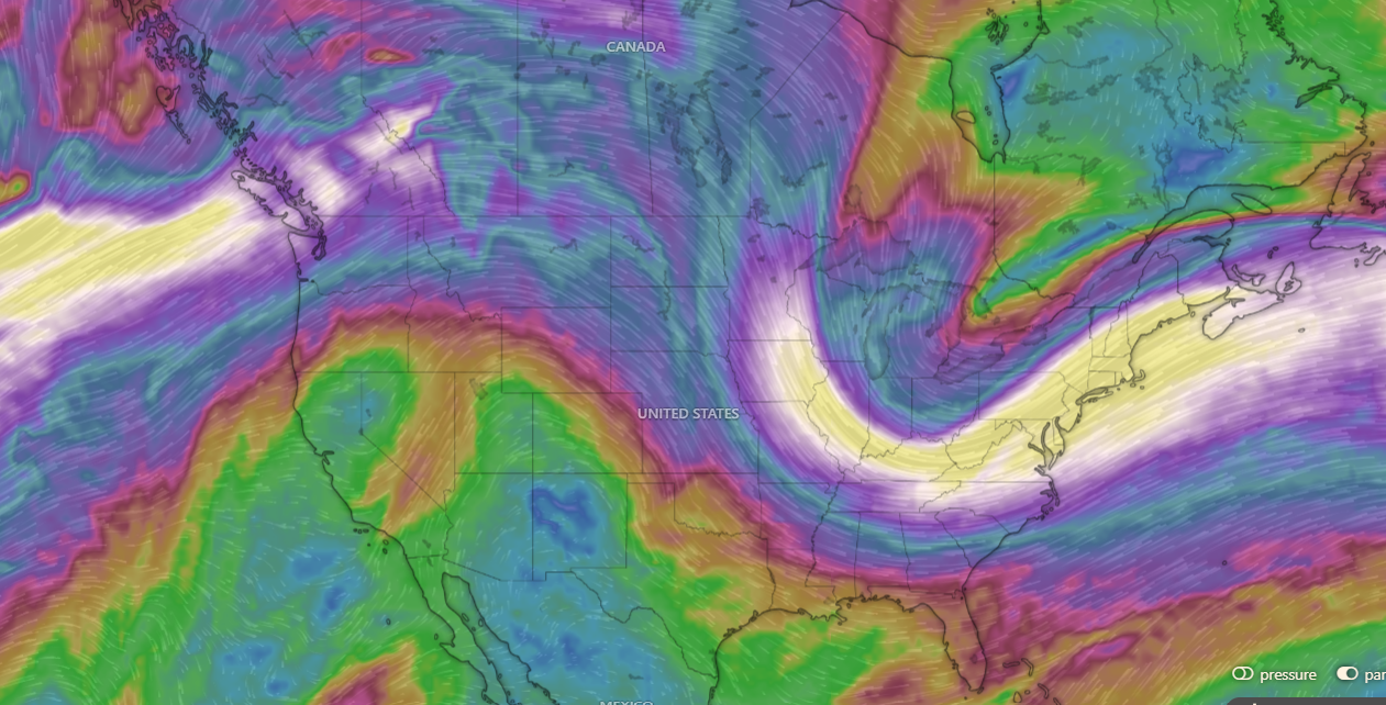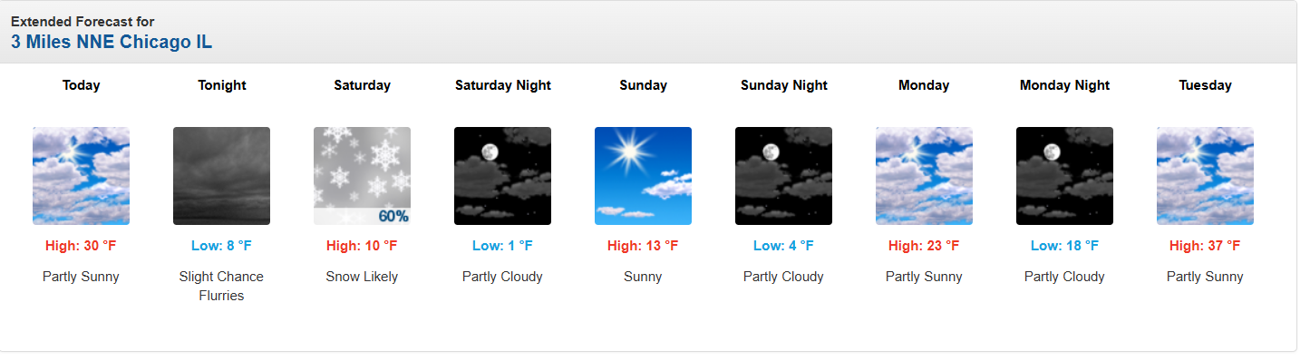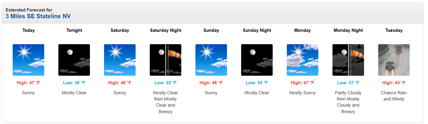 Nerd Note: The strong ridge of high pressure parked over much of the western U.S. will continue to bring near record warmth to areas of the Sierras, while to the east, a corresponding deep trough of low pressure will allow more arctic air to plunge into the midwest of the U.S. Below is a graphic showing the forecast wind pattern and speed for Sunday at about 20,000 ft above sea level, and the National Weather Service 7-day forecasts for Kirkwood ski resort (Lake Tahoe) at 9000 ft, and for Chicago.