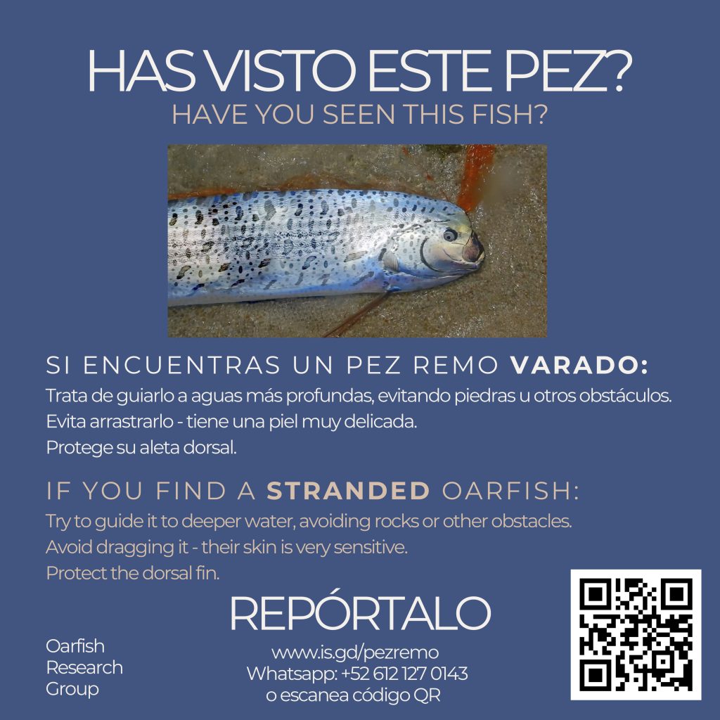 Our local Oarfish Beaching Awareness Project (whatsapp group) recently passed the torch of collecting Oarfish beaching reports to the the Oarfish Research Group at CICIMAR in La Paz. Members helped develop an Oarfish poster, created by local, (award-winning) underwater film maker, Liisa Juunti. Thank you Liisa! The poster (below) has a QR Code and link that produces a report form for beach goers to report stranded Oarfish directly to the group at CICIMAR, a Marine Sciences research and graduate studies institution.