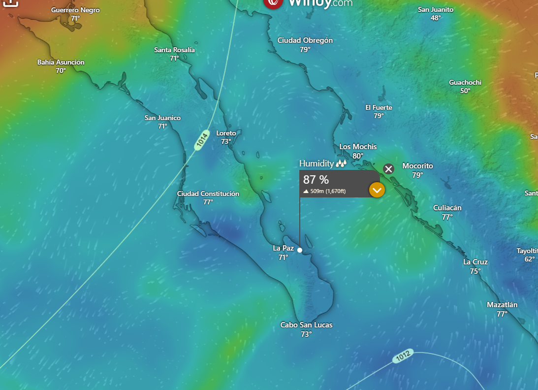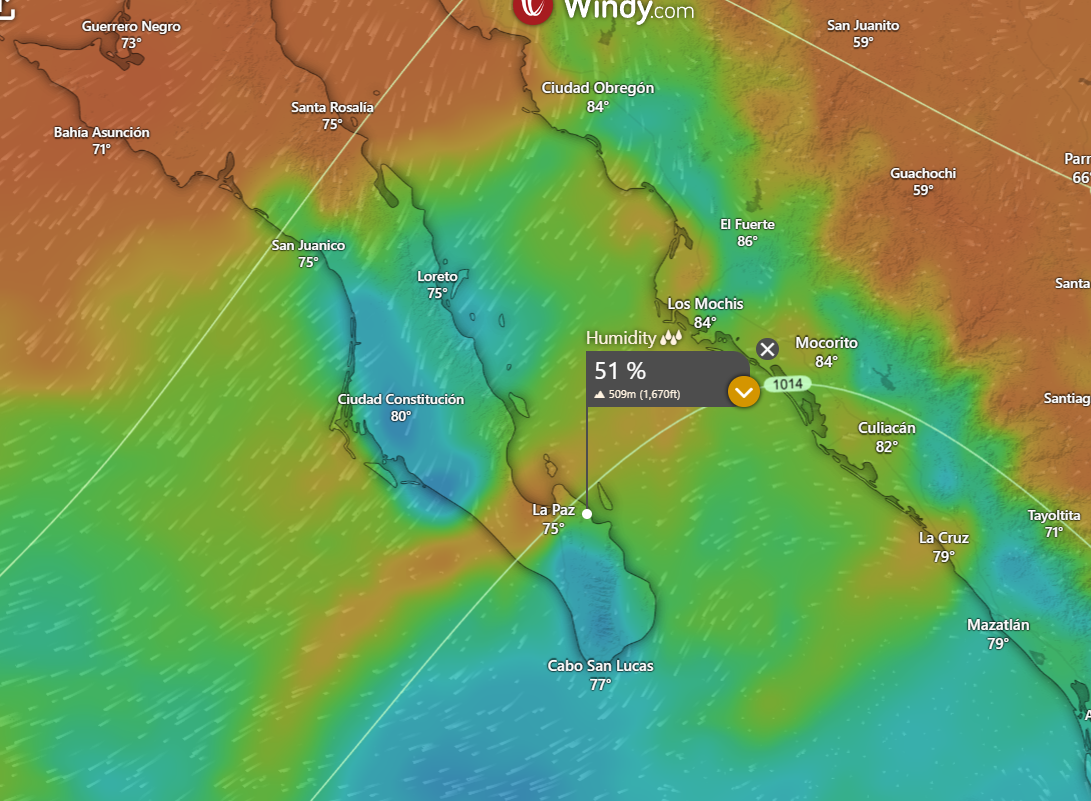 ¡Buenos dias! Local rain gauges showed storm total rainfall over the past 2 days was right around 1 inch, and the latest batch of model forecasts show that while we may see some light showers or sprinkles today, the bulk of the rain is over. Satellite passes measured north winds of around 10 knots near Cerralvo late last evening, and models show similar background flow will continue today. While this would normally be more than enough to trigger our local wind machine, satellite images show abundant low-level clouds remain over our region, and model forecasts indicate that significant low clouds are likely to last through this afternoon…effectively putting a damper on our local thermal. Of course if we see (unexpected) significant breaks in the cloud cover this afternoon, we could see rideable winds so best to be ready just in case. This rare long stretch of cloudy, rainy, no wind days will finally come to an end on Sunday as surface high pressure builds into the interior western U.S. and drier air filters into BCS. Model forecasts are in good agreement that not only will the background north flow increase significantly on Sunday, but the atmosphere will dry out as well, leaving mostly sunny skies. The graphics below show the relative humidity at around 5000 ft this aftermoon, then much drier air for Sunday. Model forecasts are in good agreement that the surface high to our north will then remain parked there for much of the remainer of the week, and with abundant sunshine expected each day, we should see a great stretch of windy days ahead.