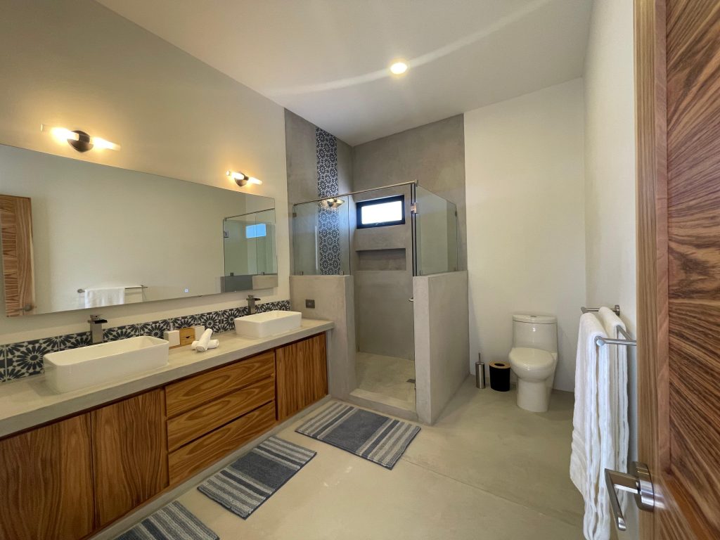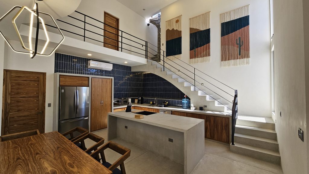 Inside, you’ll find a fully equipped kitchen, high-speed internet, smart TV, and a dedicated workspace. The home features modern Mexican architecture, soaring ceilings, and tasteful decor throughout.
