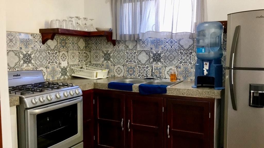 1bedroom casita, with palapa rooftop. Full size kitchen, A/C, WIFI, laundry, fenced yard, with beautiful palm trees, walking distance to the beach and kite launch (2 mins).