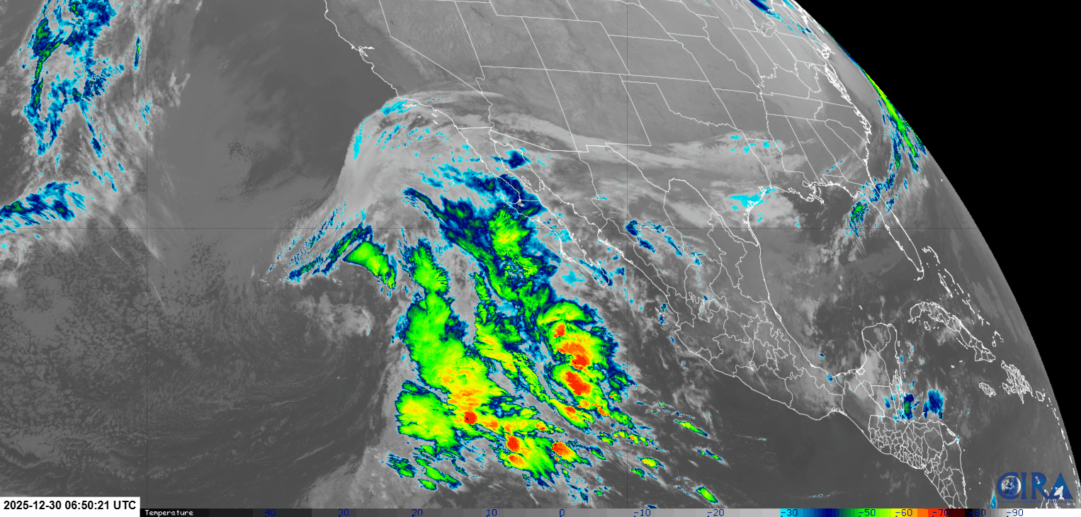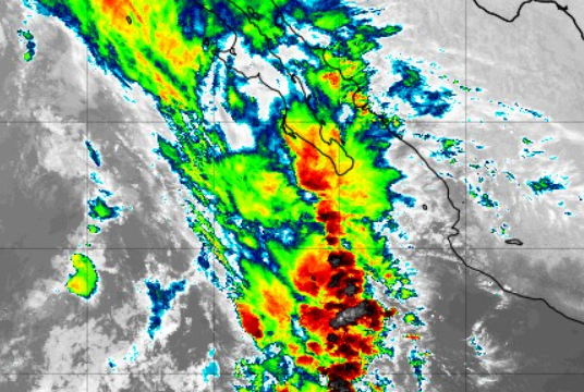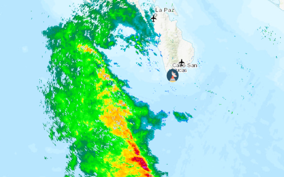 ¡Buenos dias! The Chinese Haiyang weather satellite passed over BCS around midnight and measured 15 knot NW winds over much of the southern Sea of Cortez as a surface high pressure system remains anchored near the 4-corners region of the U.S. Model forecasts are in good agreement that the NW background flow will be temporarily weakened today as a large area of low pressure to the west of the Baja Peninsula moves north towards the west coast of the U.S. Infrared satellite loops early this morning showed very thick cloud cover being drawn over our region (see below), and model forecasts indicate thick cloud cover will likely continue today with our local thermal essentially being shut down. A weather radar image from Cabo San Lucas (Mexican National Meteorological Service…see image below) at around 5 am this morning showed a large band of moderate to heavy rain about 150 km to the west, but all of the model forecasts show this area of rain will weaken as it approaches BCS, with only a few sprinkles likely here later today. The low to our west will move inland over California this evening and as drier air moves into BCS on Thursday, we will see the return of mostly sunny skies. The model forecasts are in excellent agreement that the surface high over the 4-corners area will remain essentially locked in place through the upcomong weekend and into early next week, ensuring ample north background flow here. Some thin, high clouds will continue to stream overhead from time to time each day, but sufficient filtered sun should help give us a good thermal boost as well.