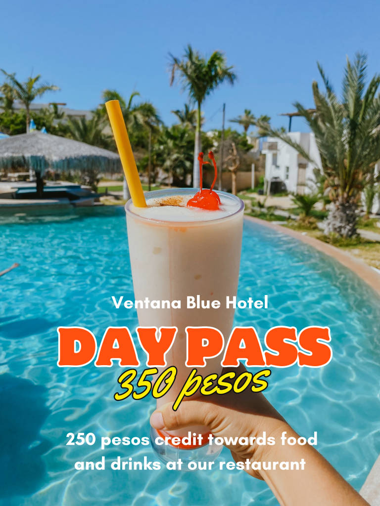Get your DAY PASS for 350 pesos, with 250 pesos credit towards food and drinks at our restaurant or bar. Children 12 and under are free!