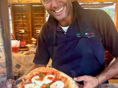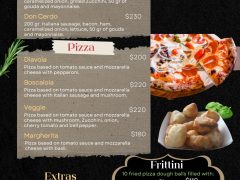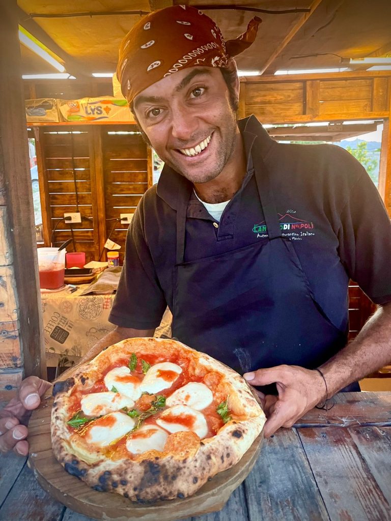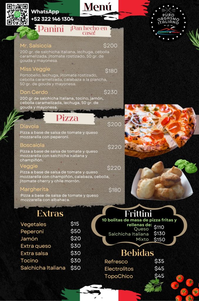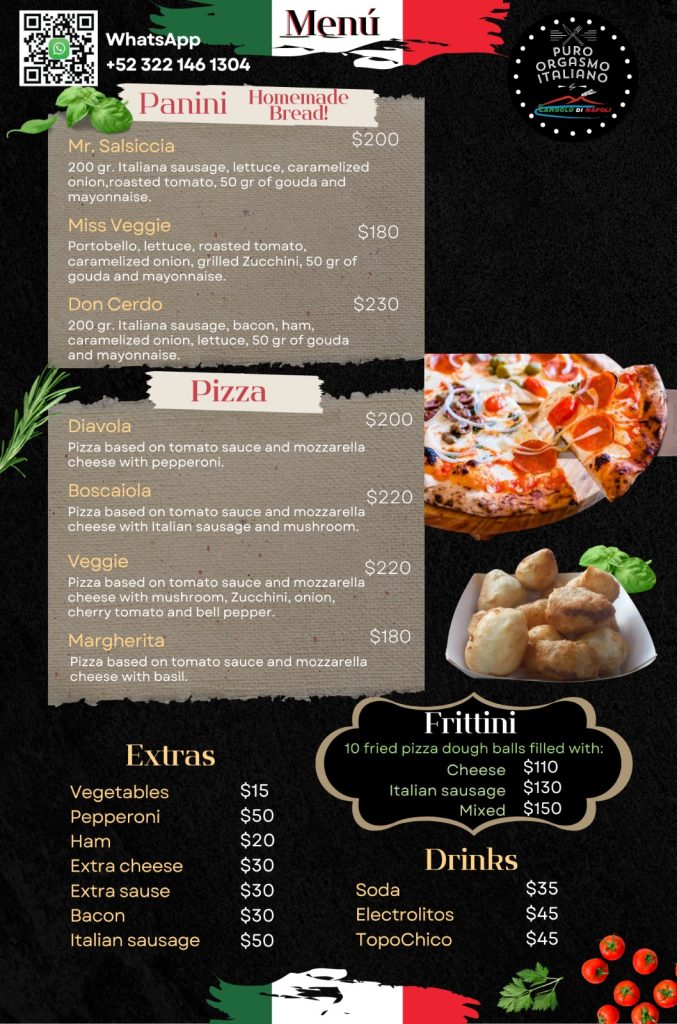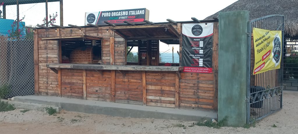 We sell authentic Italian street food, pizzas in a wood fired oven, panini (or tortas) with our homemade Italian Sausage. Soon we will also have frittinis some deep fried balls of pizza dough stuffed with cheese or homemade Italian sausage. We also sell pure sausage raw for who wants to cook at home. Next to the blue water tank in El Sargento.