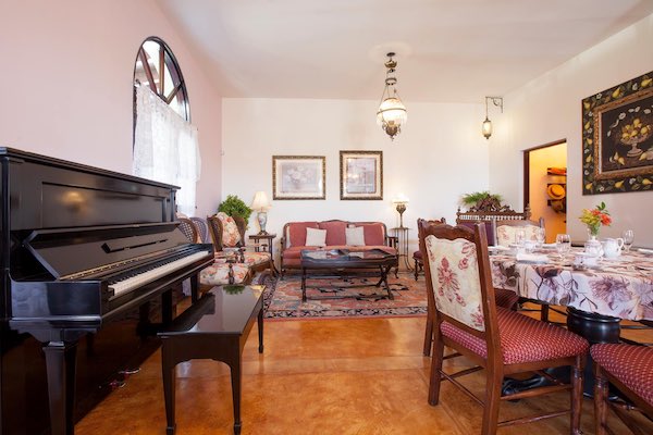 A Victorian style Tea Room located on the upper floor of the Museo Ruta de Plata, the drawing room — the Sala — is embellished with antique furnishings, a Steinway piano and a balcony with views of the surrounding village and landscape.