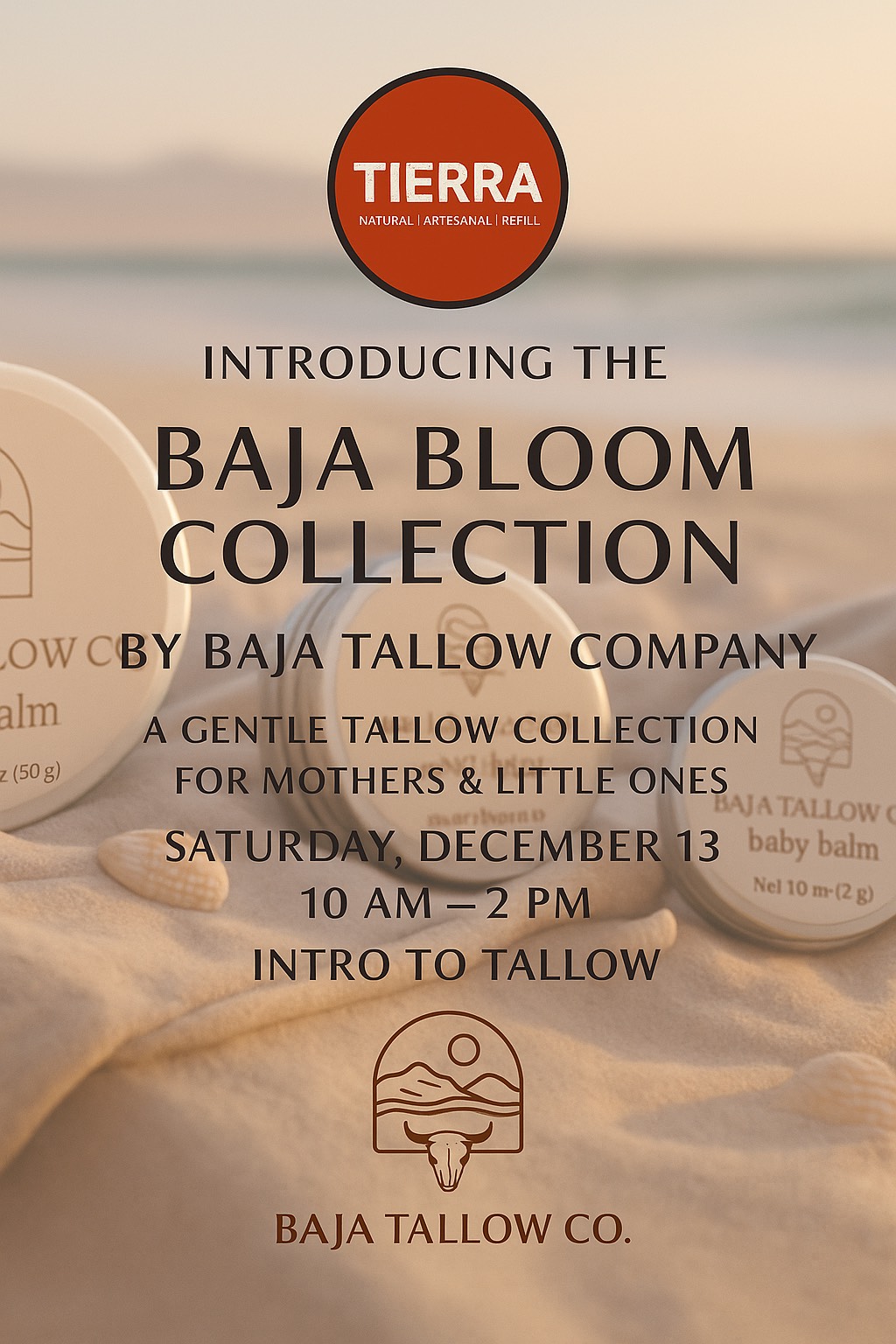 Soft launch of the Baja Bloom Collection by Baja Tallow Co. at Tierra this Saturday, December 13th, from 10 AM–2 PM.
