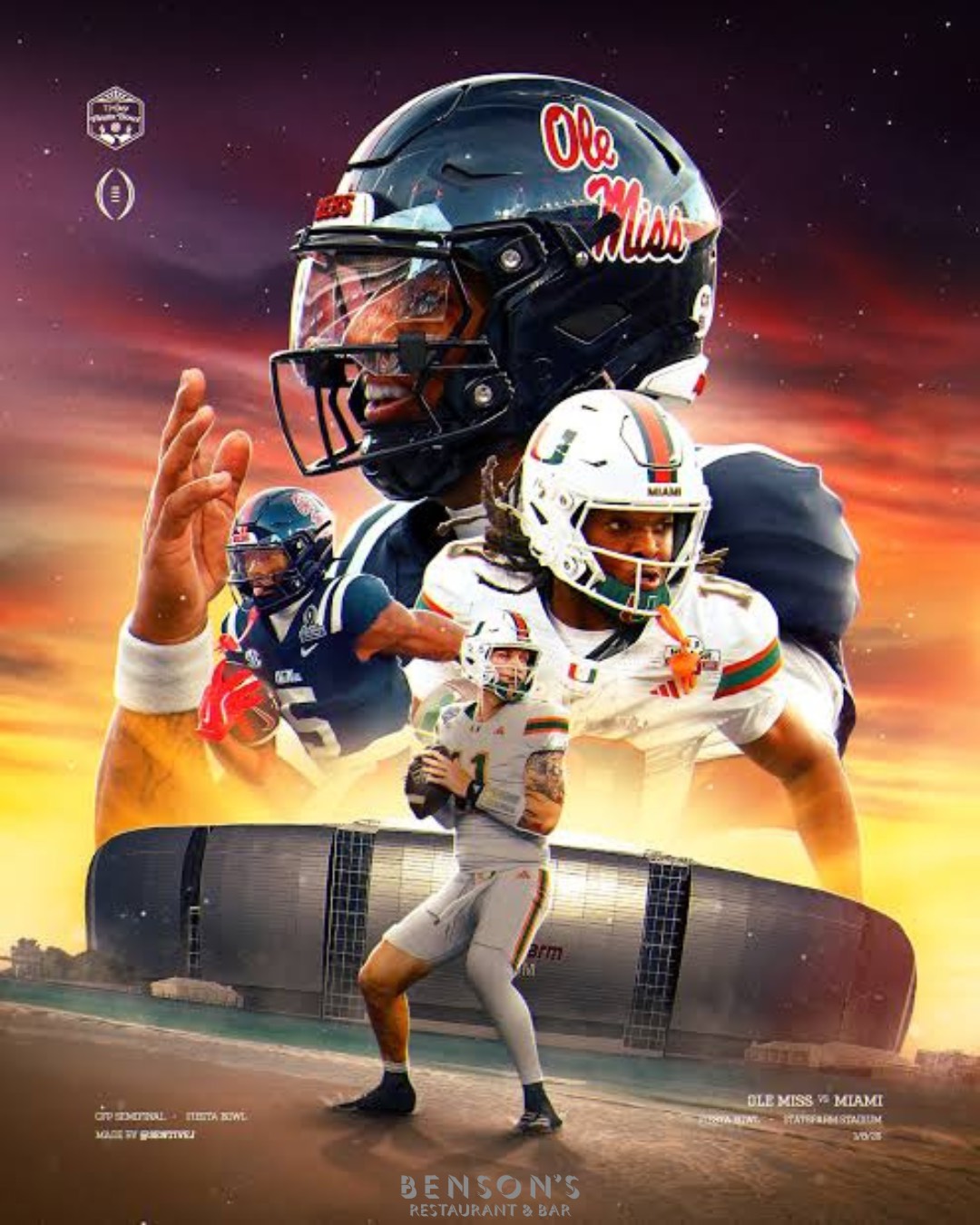 « All Events This event has passed. CFP | Semifinal at the Fiesta Bowl Thursday Jan 8 @ 5:30 pm - 8:30 pm « Aerial Yin Yoga (evening) with Celia House Sessions – Vol 4 » Miami FL vs Ole Miss – Happy hour: 2×1 classic margaritas from 7–8 PM Add to calendar Google Calendar iCalendar Outlook 365 Outlook Live Details Date: Thursday Jan 8 Time: 5:30 pm - 8:30 pm Venue Benson’s Restaurant & Bar