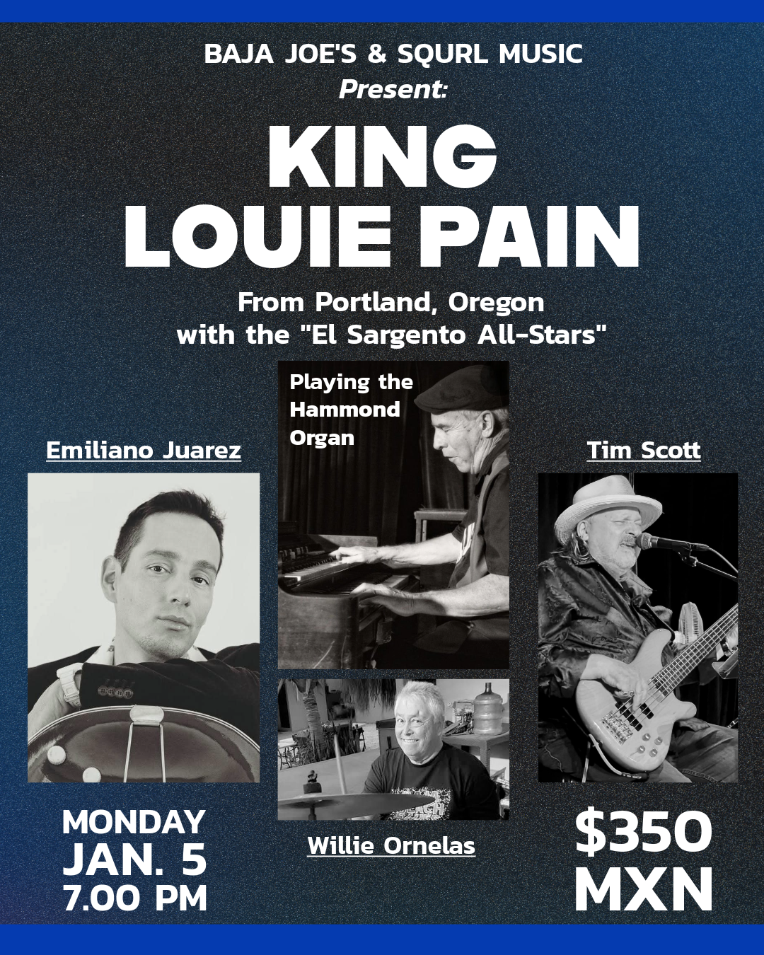Round 2 of Blues at Baja Joe’s is happening this Monday, Jan 5th, and the talent on stage is absolutely staggering.