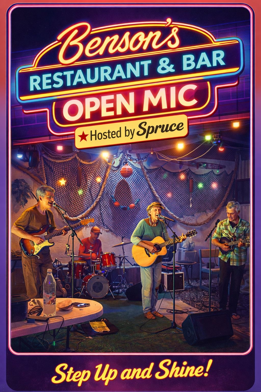 Open Mic/Jam Every Friday Night…Hosted By Spruce Baugher…Come Sing, Play Your Songs, Jam With Other Musicians Or Sit Back & Just Enjoy The Amazing Talent In Town…Full Band Pro PA Audio Gear & An Acoustic/Electric Guitar & Drums Provided Each Week Under The Bright Lights & Neon Of “BENSON’S RESTAURANT & BAR” Early Signup 6:30pm Showtime 7pm…Happy Hour Classic Margarita 2×1 7-8pm…Get Your Jam On! sprucebaugher.com ☮️❤️