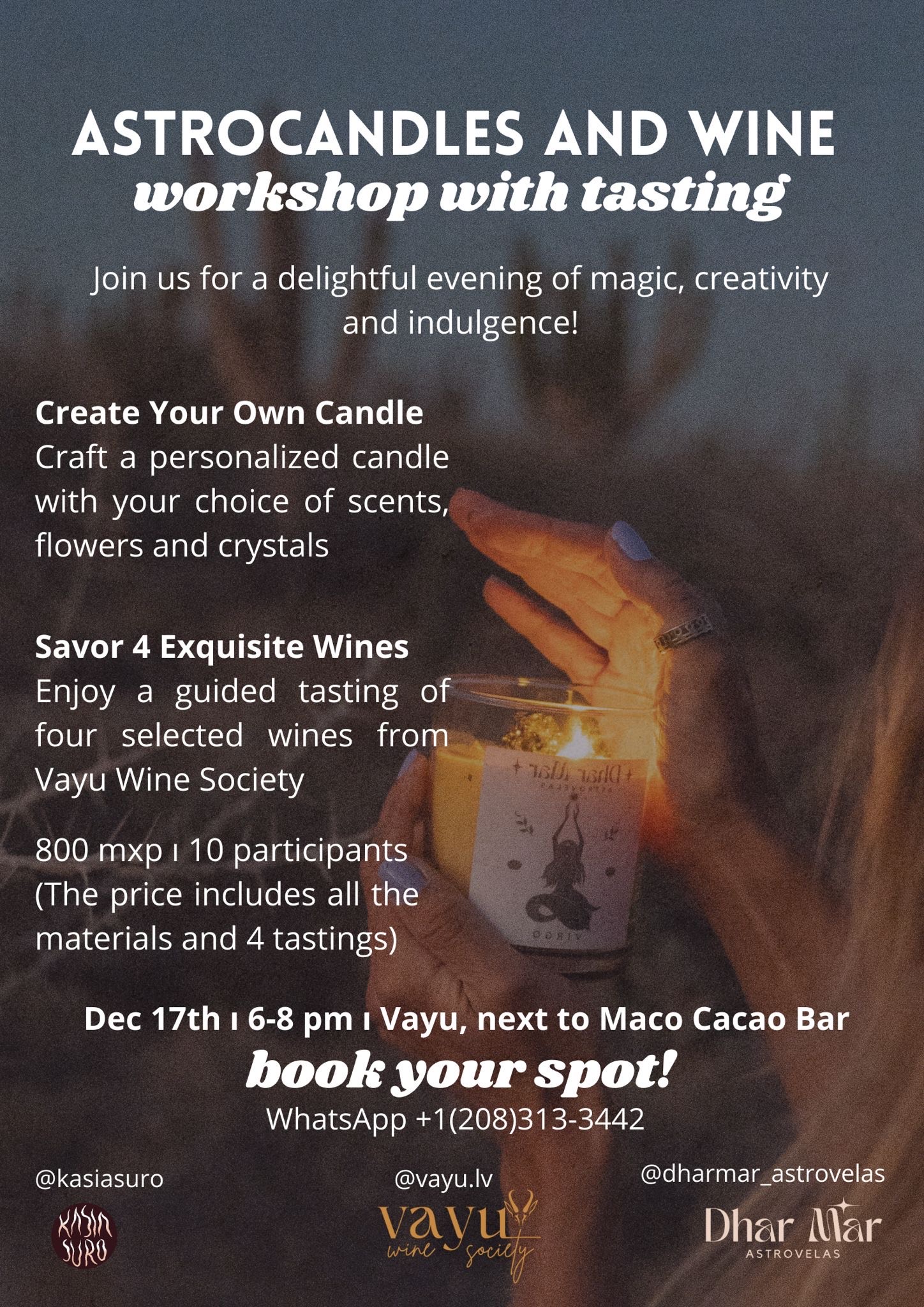 Join Dharmar Astrovelas and Colectivo Vayu for an evening of intention setting, pouring your personalized candle, and exploring wines of Mexico. Create the perfect gift for yourself or a loved one!