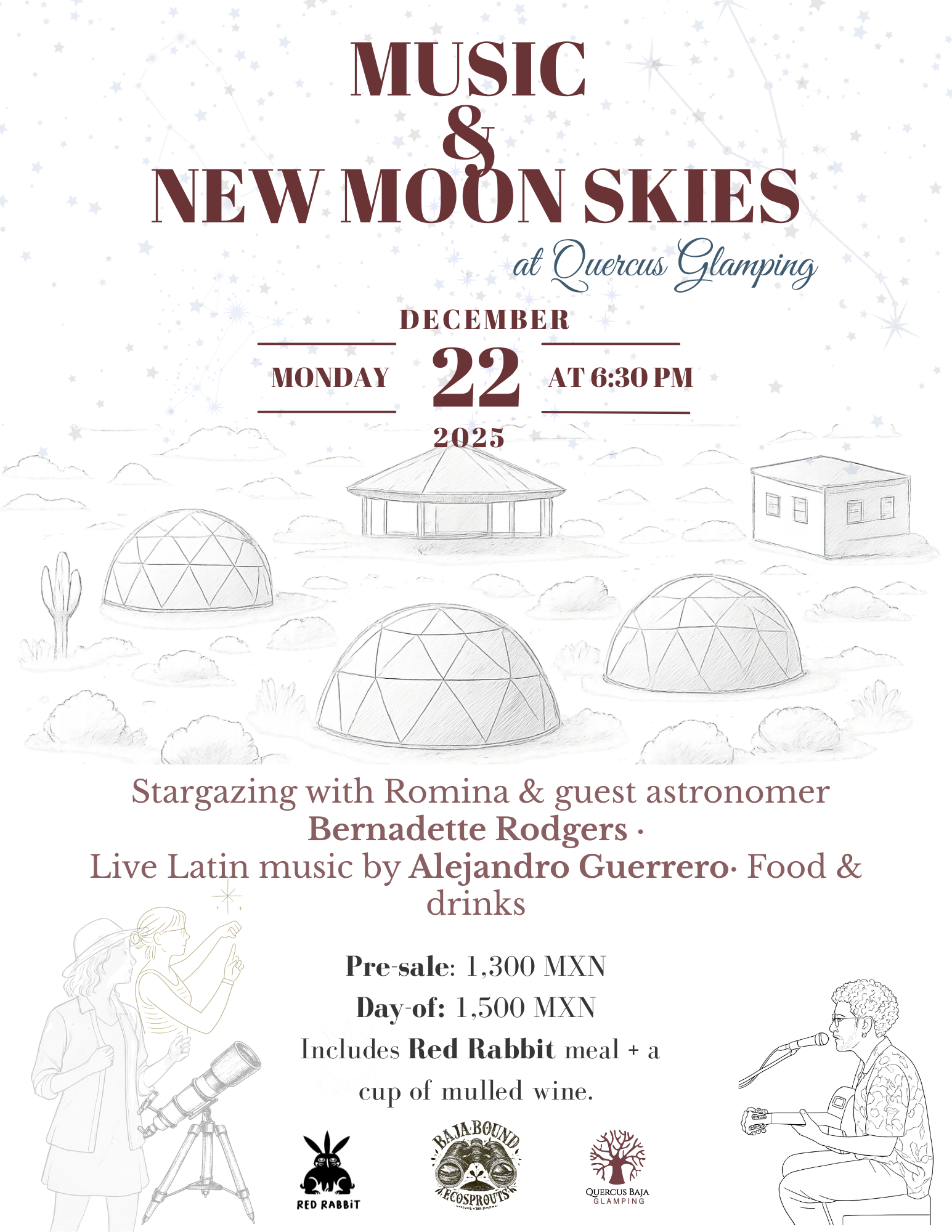 Stargazing with Romina & guest astronomer Bernadette Rodgers. Live Latin music by Alejandro Guerrero. Food & drinks. Pre-sale: 1,300 MXN. Day-of: 1,500 MXN. Includes Red Rabbit meal + a cup of mulled wine.