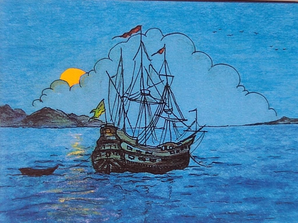 Kcuhc and Ykceb led the group up a winding trail, crossed a sandy arroyo, and climbed to a cave where they took refuge. Yrag looked back at the island and did a double-take. He saw a huge raft with flapping white wings entering the bay at the island’s south end. We made the right decisión to move camp, he thought to himself. His grandfather had told stories about strangers who once came ashore from such a floating giant and threatened some of the women gathering food.