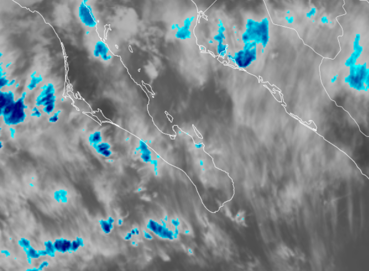 ¡Buenos dias! Sustained winds at the campground yesterday peaked at 20 mph with gusts to 29 mph, with inconsistent and gusty conditions noted at Rasta. An Oceansat satellite pass just after midnight measured NW winds of 20 knots near Cerralvo, and wind gusts up to 30 mph were measured just up the hill from Rasta Beach early this morning. While nearly all of the most recent model forecasts show the norte weakening this morning, solid NW background flow will continue through this afternoon. Models are also in good agreement that a west component will continue today, particularly on northern beaches, so expect gusty, wind-shadowed conditions there. I will mention that for the past couple of days the HRRR (High Resolution Rapid Refresh) model has been consistently forecasting strong winds farther out into the bay along the track of today’s Lighthouse 1000 race (see graphic below of HRRR forecast of sustained winds for 1 pm today). This latest norte is forecast to die a quick death tonight, and Sunday will likely see only marginal winds at best. A weak surface pressure gradient is forecast to continue over BCS on Monday, then surface high pressure centered far to our north will build into the Baja Peninsula on Tuesday with increasing north background flow. At this point the forecast models are in good agreement that sufficient north background flow will continue through Thursday and possibly into Friday.