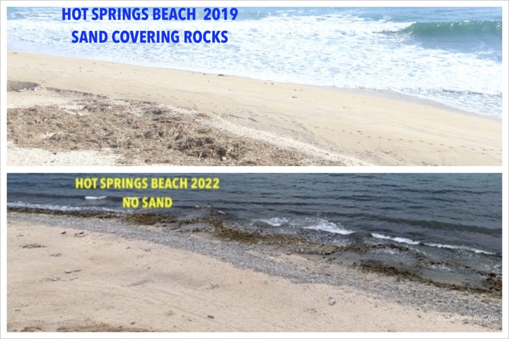 Therefore when there are extended periods of NO rain over a decade and no “flash floods” to dump sand into the sea, the beaches become narrower. And if the drought continues, the underlying rocks are exposed as the sand moves south, and there are no flash floods to replenish it from the north. The time it takes for the beaches to start losing sand and exposing rock is unknown because no one has done the needed monitoring. But during February 2022, someone dumped eight six-cubic-yard dump trucks of sediment over the rocks at the Punta Gorda Trailhead and “created” a beach for a few weeks until an “El Norte” occurred. This sediment was very different in color from the usual whiter beach sediment on our shores. Developers probably took it from one of the arroyos where builders mine it for construction, and it had a bit more brownish residue. Four weeks later, after a few El Nortes and high tides, sediment began showing up at the north end of Hot Springs Beach, and about a week later, it arrived on Rasta Beach. That’s the best data about the time it takes for sand to move south and provides an excellent opportunity to understand the sand movement.