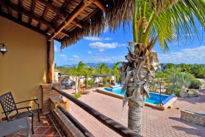 Multi-level design Casa has third floor view terraza with aluminum shade structure. 2 bedroom 1 bath with AC througout and big swimming POOL and patio...