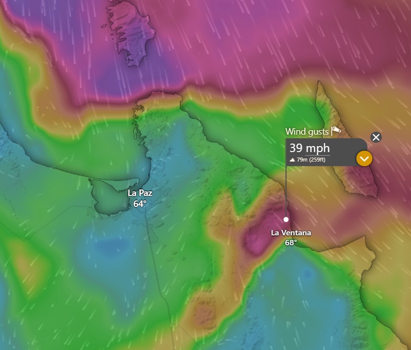 ¡Buenos dias! Well, yesterday was really wierd. Even though an afternoon satellite pass confirmed model forecasts of 15 knot north background flow coming into the bay, and we had a nearly cloudless sky, our local thermal was a virtual no show as 10 minute sustained winds at the campground only peaked at 16-18 mph. I don’t have an explanation for why we didn’t see much stronger winds yesterday…sometimes the atmosphere will still throw a real curve ball! A satellite pass late last evening confirmed that the norte has arrived, with 20-25 knot winds measured from Mulege southward to the East Cape. With such strong background flow, our local thermal usually doesn’t add much to the windspeed, but it will likely pull much of the west component out of the wind by this afternoon. That said, northern beaches may see some wind-shadowing as the wind direction remains nearly due north. Models show the norte peaking tonight (see nerd note below) then gradually subsiding on Monday. Several model forecasts are showing just enough north flow remaining on Tuesday to help trigger our local wind machine and bring us one more rideable afternoon before a long stretch of light wind days starts Wednesday…possibly lasting into early next week.