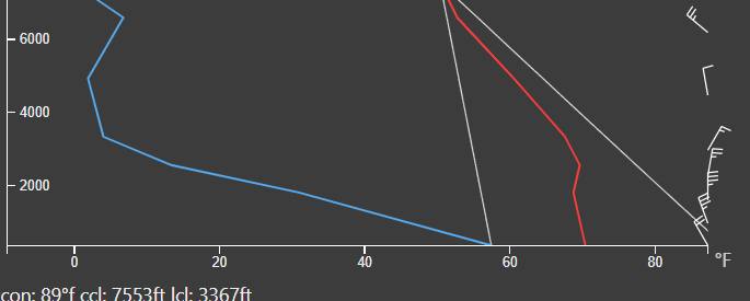 Nerd Note: Model forecasts are in good agreement that the norte will peak tonight, with NNW background flow just north of the bay of around 25 knots. An interesting phenomena is forecast to occur by the HRRR model, which has a 3 km resolution with the ability to resolve much smaller scale features than the global models like the ECMWF and GFS. As the strong norte winds approach the Cacachilas Mountains, they bank up against that barrier and the wind speed slows significantly as the flow is forced up and over the mountain barrier. The model also shows a nearly constant temperature with height up through around 4000 feet (see the red line in the second graphic), which is very stable so as the air is forced up over the mountains, it cools and becomes much ‘heavier’ than the surrounding relatively warm atmosphere. The air then sinks rapidly on the lee side of the Cacachilas Mountains and accelerates into what is called a mountain wave wind. The HRRR model is forecasting wind gusts of nearly 40 mph tonight particularly in areas just downslope of the mountains (El Sargento).