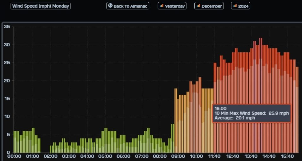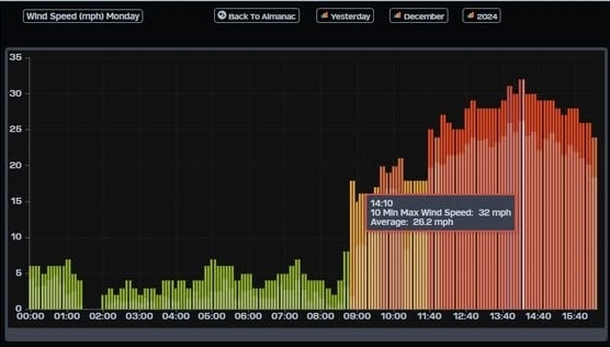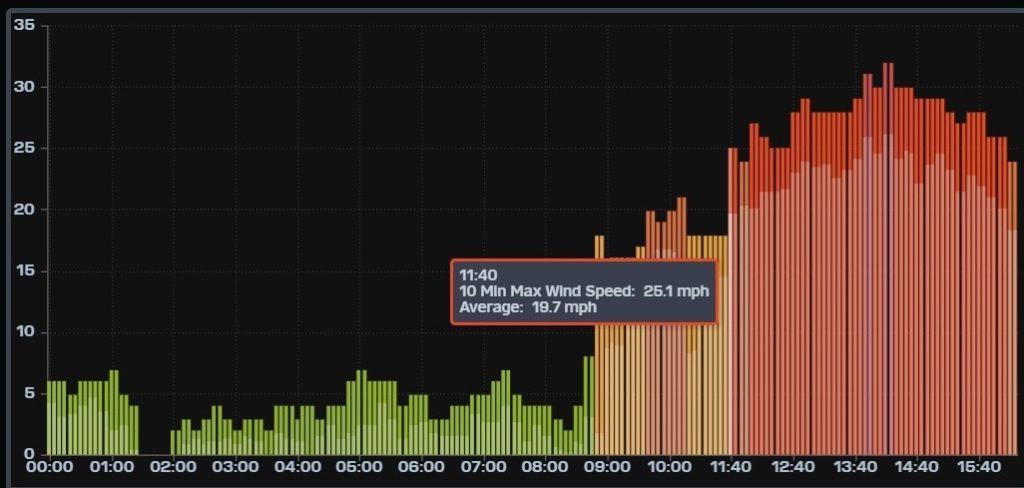 ¡Buenos dias! Yesterday was a feast for those who like it really windy, as the wind gauge at the campground (see images below) showed the 10 minute average winds ranging from 20-24 mph from just before noon until 4 pm, with winds peaking at 26 mph for around 30 minutes near 2 pm, with gusts well into the 30s. All of the most recent numerical model forecasts show the strong north background flow easing off some today, however there will still be ample north flow and with full sunshine we will definitely see a windy afternoon. No significant changes needed in the going forecast, as all of the latest forecast guidance shows surface high pressure locked-in to our north and solid north flow continuing into the upcoming weekend. Long-range model forecasts do show we will finally see the surface pressure gradient weaken early next week, with lighter winds likely on Monday.