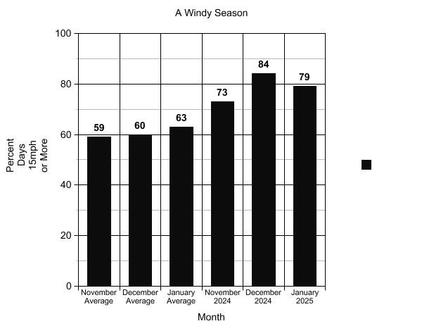 Nerd Note: Many of you have commented on how windy this season has been. Here is a graph showing the normal percentage of days with winds of at least 15 mph (from our friends at ikitesurf) compared to the 2024/25 season so far.