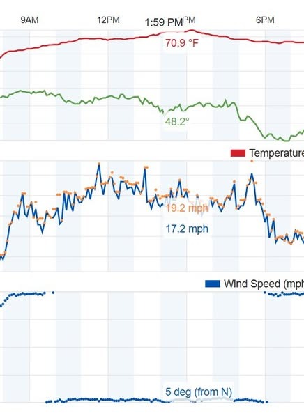 Nerd Note: The wind gauges at Rasta and the main campground yesterday showed very different conditions (see graphs below). The wind direction at Rasta hovered around 5 to 10 degrees, while at the campground it was more like 10-15 degrees. This seemingly trivial difference in wind direction had a big effect on the quality of the wind, with the graph at Rasta (left side) showing very gusty wind (personally confirmed by a really crappy session), while the graph at the campground (right side) showed steadier winds. The HRRR model forecast for today again shows a north-northwest to north wind near and just north of Rasta, and more north-northeast winds along the southern beaches. The background flow is forecast to be just a bit weaker today than the nortes of the past 3 days, so I’m hoping that our thermal may be able to pull the winds, even on the northern beaches, more to a NNE direction…we’ll see.