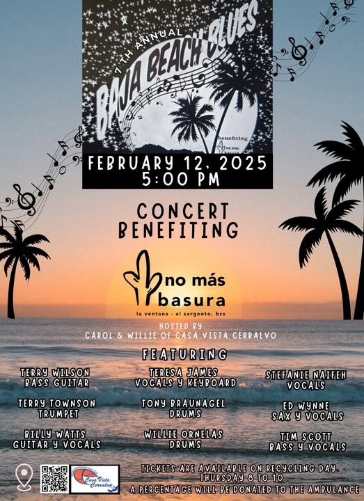 Note…We will be selling tickets and t-shirts today for the upcoming Baja Beach Blues concert at the No Mas Basura recycling day, just west (upslope) of the farmers’ market. ALL profits go to benefit the great work of No Mas Basura!