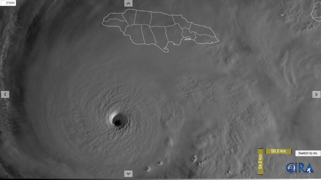Nerd Note: A potentially catastrophic event is unfolding for the island nation of Jamaica, as a hurricane hunter aircraft early this morning showed hurricane Mellisa has become a category 5 storm with sustained winds of 160 mph. The storm is expected to make landfall on the southernwestern coast of Jamaica tonight. Here is a visible satellite image from just after sunrise showing the dark, clear eye, and sunlight reflecting off the western eyewall showing the spectacular stadium effect as the eyewall flares outward with height.