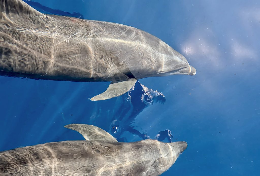 Highly intelligent and deeply social, bottlenose dolphins display complex behaviors and possess brains larger than ours. They communicate through a rich language of squeaks and whistles, with each individual having a unique “signature whistle”. They are very active on the surface and are keen bow-riders and wake-riders. We see them playing with our boat many times, and even sometimes “snout-riding” in front of large whales!