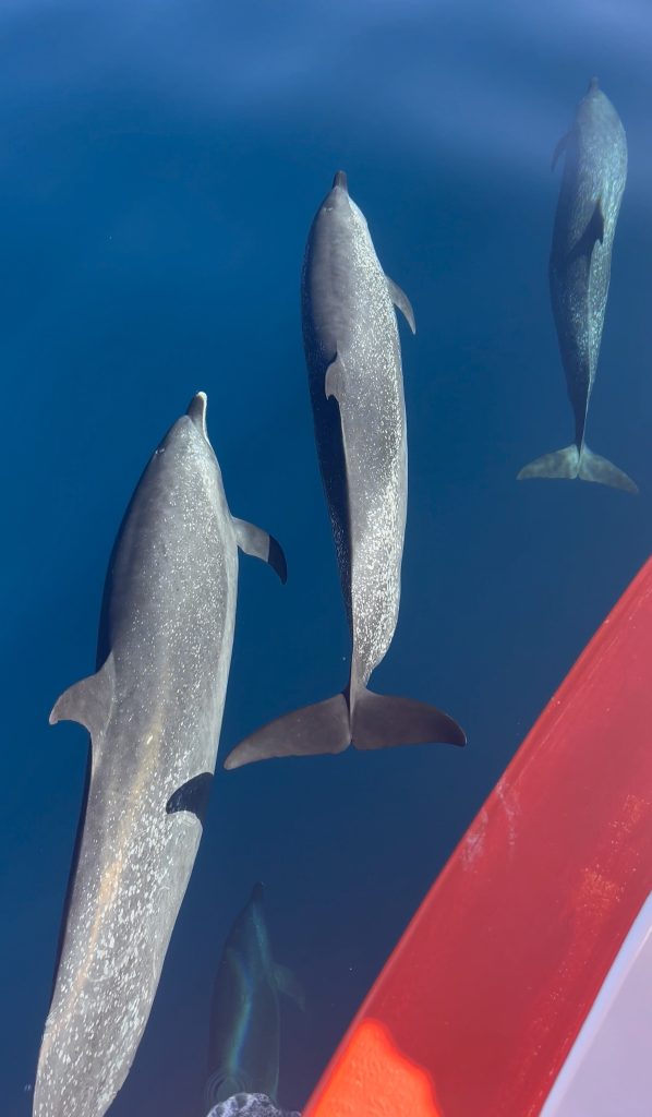 Over the past few weeks, we’ve had the pleasure of encountering these playful and charismatic dolphins all around us. Often, we’ve seen them in large groups, feeding together and accompanied by opportunistic sea lions eager to grab a few leftovers. They’re among our most frequent visitors, sometimes appearing as small family groups, and other times delighting us with the sight of large pods cruising through the water.