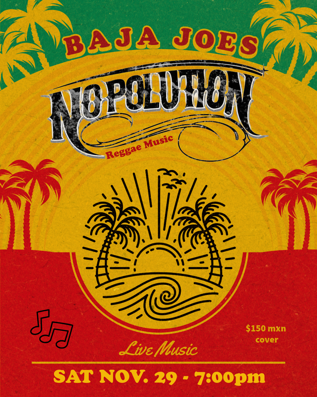 Baja Joe's La VentanaSaturday, November 29th 7:00pm -$150 mxn cover Nopolution is a reggae band formed in mid-2008 in La Paz, BCS, Mexico. Their live show features a wide repertoire of Jamaican reggae hits, Spanish-language reggae, and original music, blending styles across the genre—from roots rockers to dub and rocksteady. They have performed at numerous festivals throughout the Read More