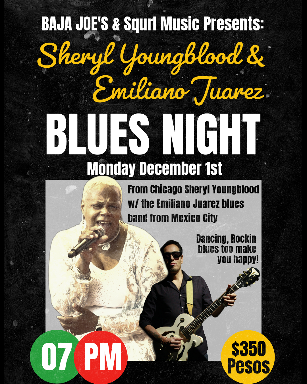 Baja Joe's La VentanaMonday, December 1st 7pm - From Chicago, blues & soul singer Sheryl Youngblood backed by Emilliano Juarez from Mexico City on Guitar and the La Paz Rhythm section.
