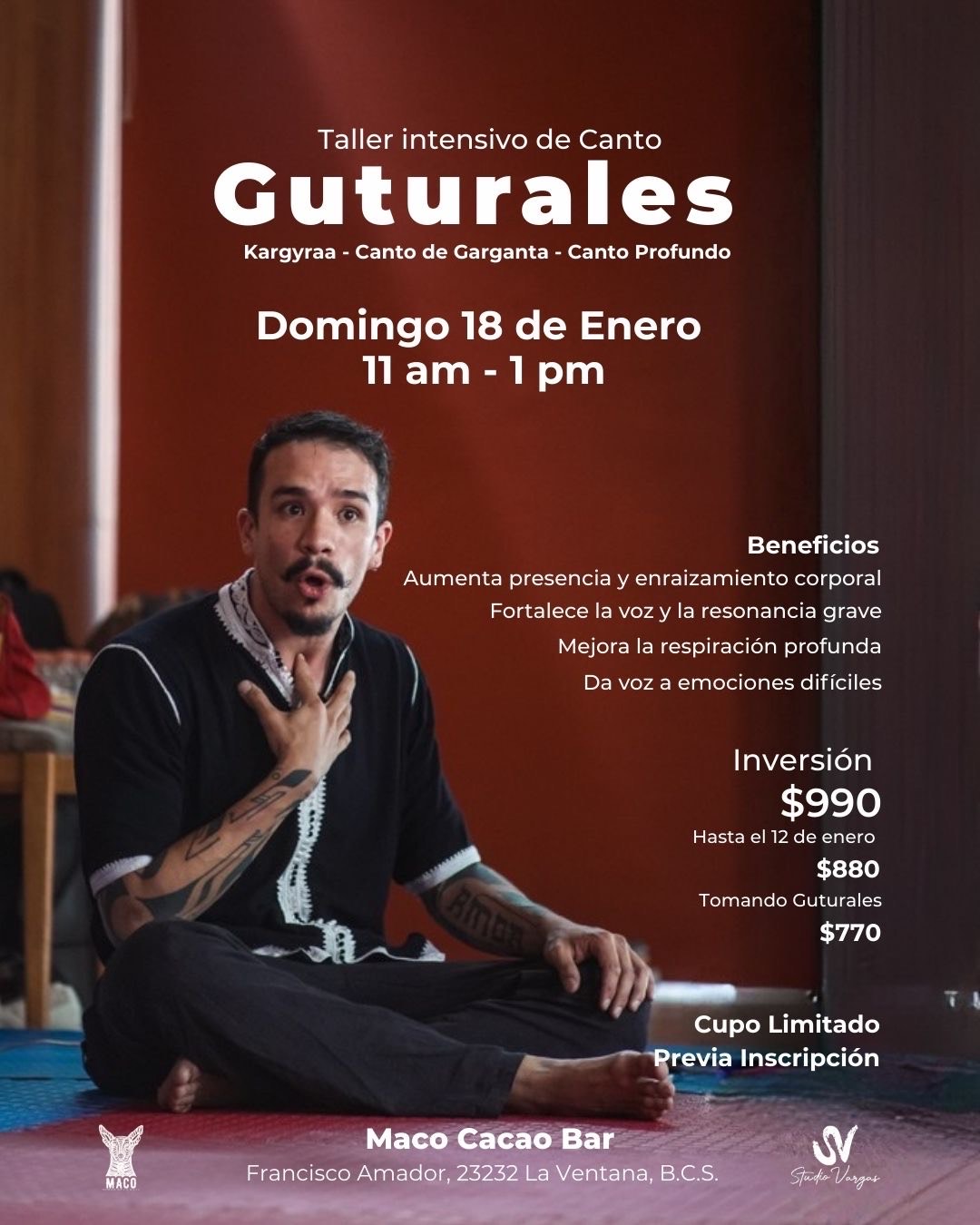 Maco Cocao BarKhoomei · Kargyraa · Deep VoiceExplore the power of the deep voice and breathing techniques from ancestral guttural singing, focused on presence, rooting, and vocal control.🗓 Sunday, January 18 ⏰ 11:00 am – 1:00 pm 📍 Maco Cacao Bar Francisco Amador, 23232 La Ventana, B.C.S.⚠️ Limited spots | Prior registration required💰 Investment • General: $990 • Until January 12: $880 • Read More