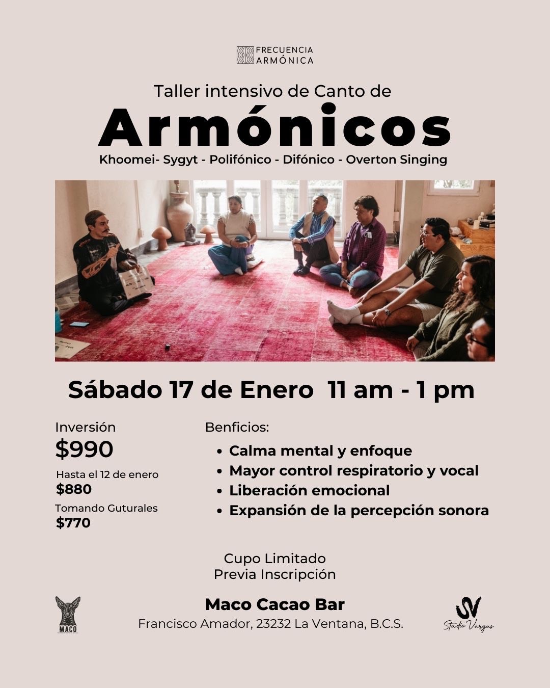 Maco Cocao BarKhoomei · Sygyt · Harmonic · Polyphonic · Overtone SingingA space to explore the voice as a resonant instrument, tuning in to internal listening and harmonic precision.🗓 Saturday, January 17⏰ (time to be confirmed / same range)📍 Maco Cacao BarFrancisco Amador, 23232 La Ventana, B.C.S.⚠️ Limited spots available | Pre-registration required💰 Investment• General: $990• Until Read More