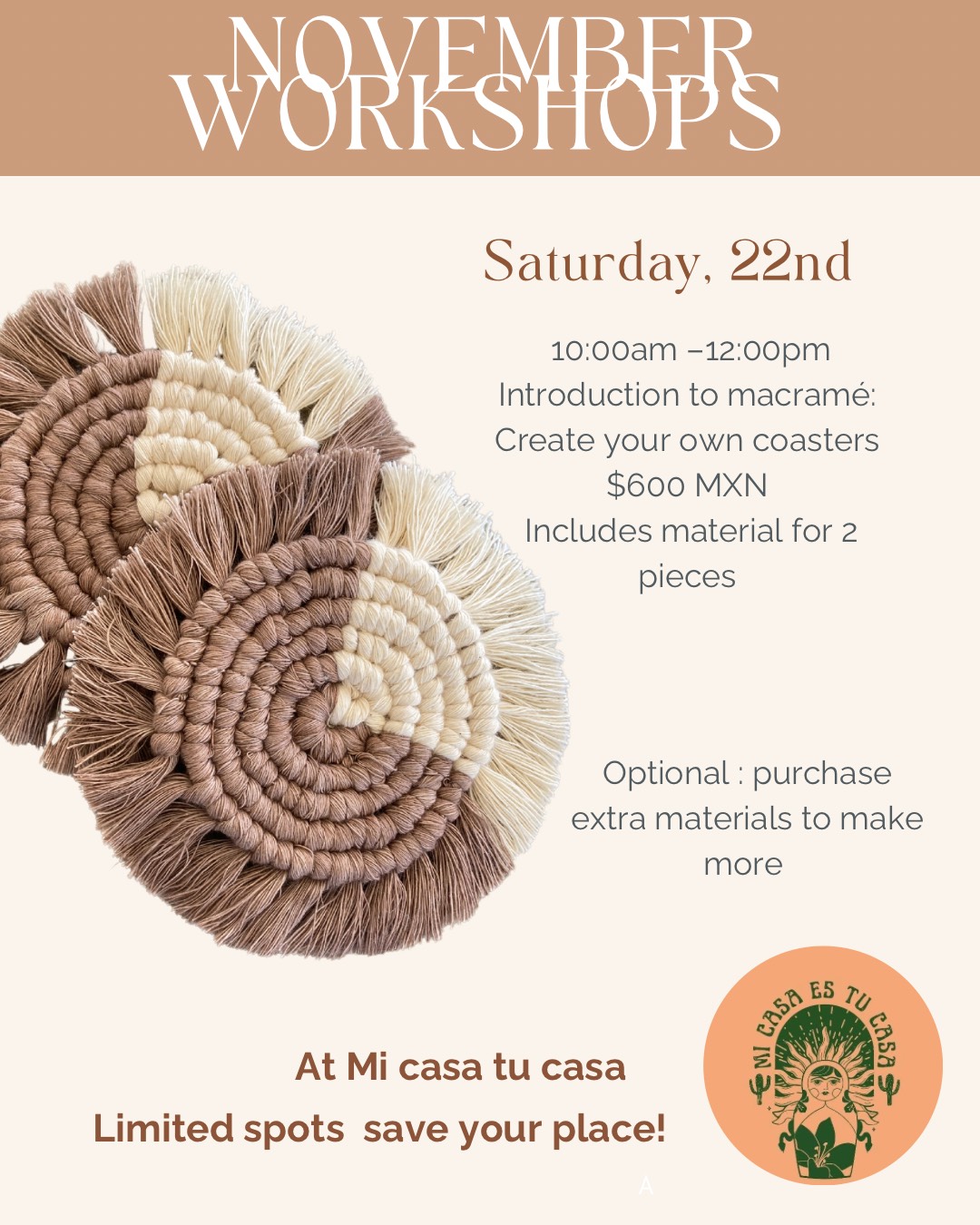 Mi Casa es Tu CasaDesign and create your own macrame coasters $600 MXN Includes material for 2 pieces At mi casa tu casa Reserve your spot in advance. WhatsApp +52 9841829211 - macrarenamx@gmail.com - Ig: @macrarenamx